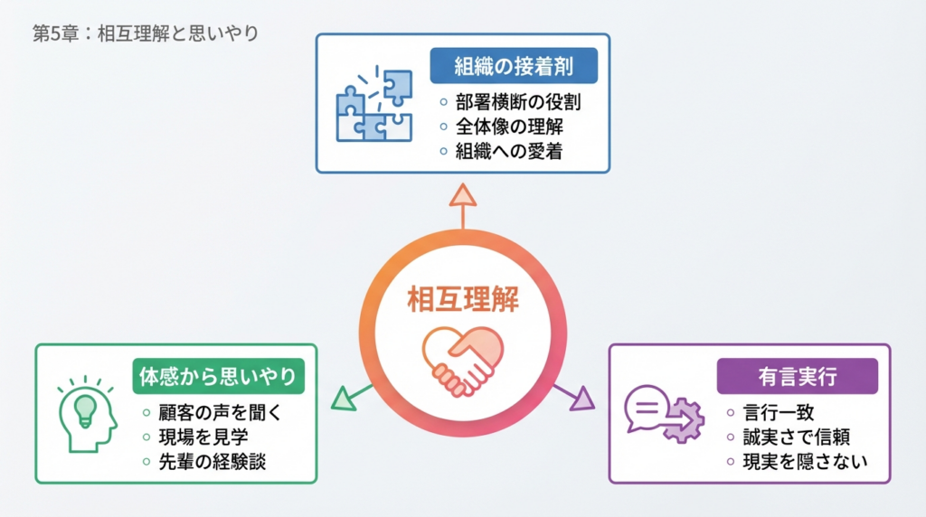 たとえば、営業に同行させて顧客の声を直接聞かせる。カスタマーサポートに一時配属して、「お客様がどんなことで困っているのか」を肌で感じさせる。製造現場を見学させて、「自社製品がどうやって作られているか」「現場の人たちがどれだけ苦労しているか」を知らせる——こうした体感を通じて、彼らの中に「お客様のために」「現場の仲間のために」という思いやりが芽生えます。
